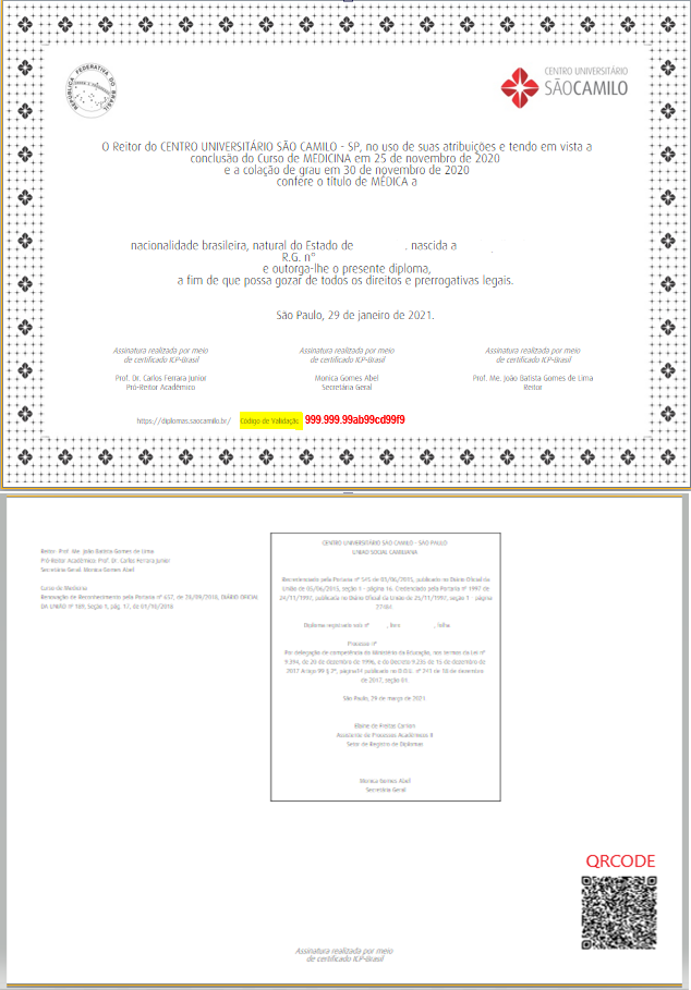 - Representação Visual do Diploma Digital (RVDD) disponibilizada em formato PDF (com caráter meramente ilustrativo) assinado e validado digitalmente que pode ser impresso pelo formado em qualquer papel. Essa representação, embora semelhante ao diploma em papel possui um código de validação e QRcode que permite verificação de autenticidade e o acesso ao XML desse diploma no site do Centro Universitário São Camilo. O QR Code está atrelado à Uniform Resource Locator (URL) única do Diploma Digital do Centro Universitário São Camilo.